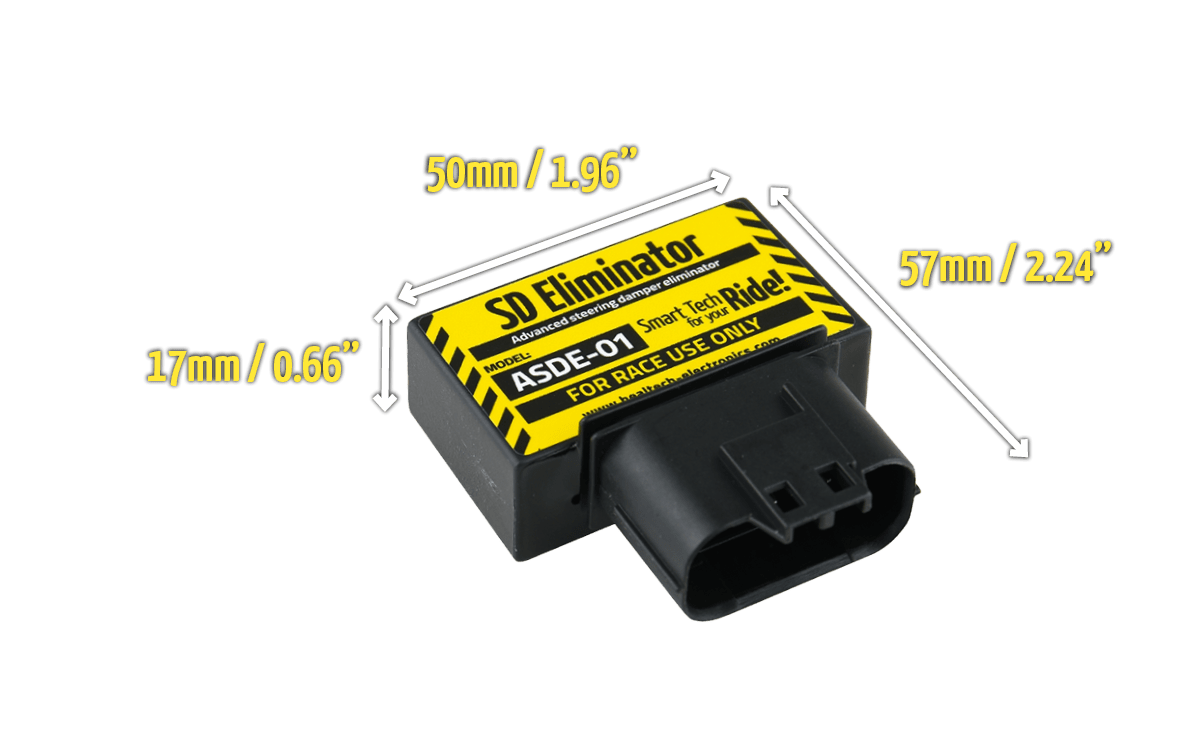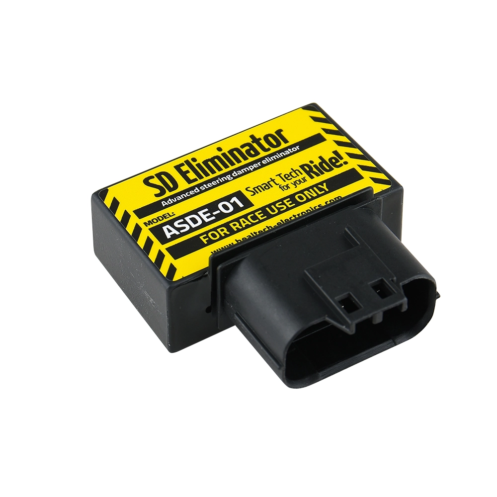 If you are serious about racing, then the factory electronic steering damper must be replaced, too. However, disconnecting the factory damper from the bike’s main harness will instantly result in the FI light coming on (which could mask some serious bike/engine-related faults). This is where the SD Eliminator comes in handy – just plug it into the factory damper’s connector, and you’re ready to go!
